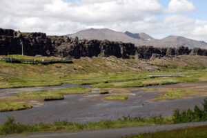 If you only do one geological thing in Iceland, do this one. Þingvellir (Thingvellir) National Park, an hour east of Reykjavik, is where the rift comes ashore in the south of the country. You can stand inside it. Almannagjá, “Everyman’s Gorge”, is a long, walkable cleft cutting north-south through the basalt. The wall on its western side is the easternmost edge of the North American tectonic plate. A few hundred metres to the east, the cliff at Hrafnagjá is the western edge of the Eurasian plate. In between is what geologists call a graben, a strip of land that has dropped down as the two sides pulled apart. The whole valley is being pulled open at the same 2 cm a year.