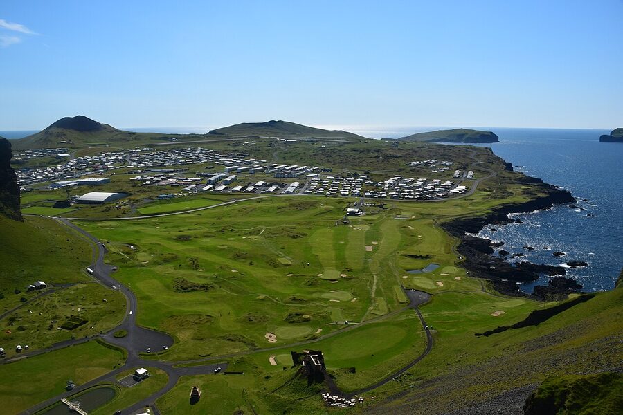 Herjólfsdalur, on the western side of the island, is the natural amphitheatre at the foot of the cliffs where the festival happens. Outside festival weekend it’s a quiet grassy bowl with a few replica turf houses and an easy walking loop. There’s a longer trail that climbs up the ridge above Herjólfsdalur for views back over the bay; that one takes about two hours and is well worth it on a clear evening when the light goes long and gold.